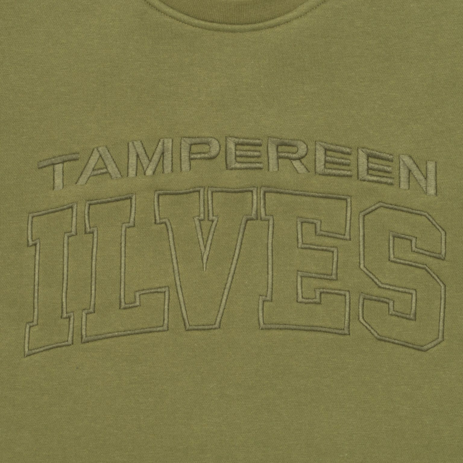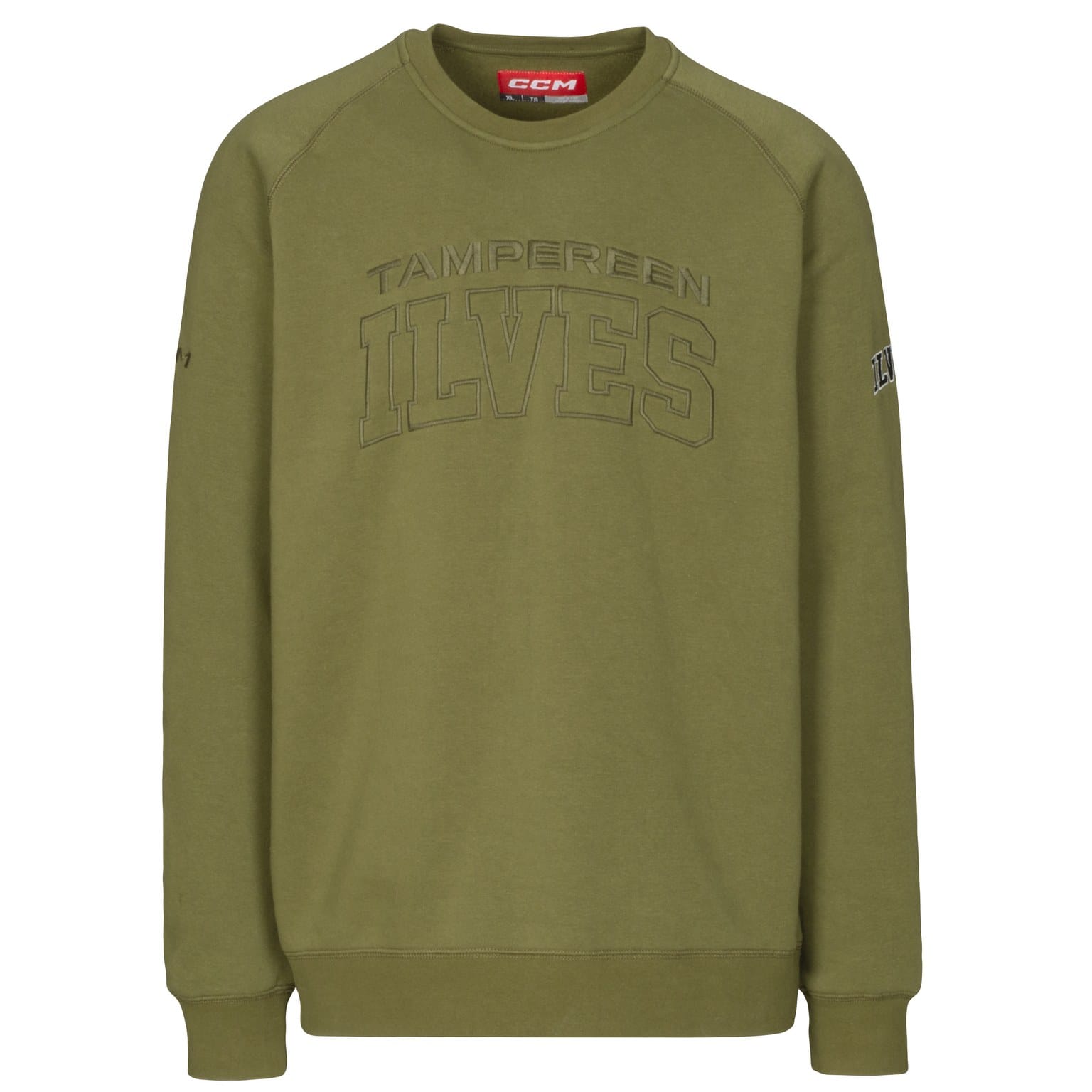 CCM:n valmistama metsänvihreä collegepaita, jossa edessä vihreällä brodeerattu teksti Tampereen Ilves ja vasemmassa hihassa mustalla ILVES-teksti.