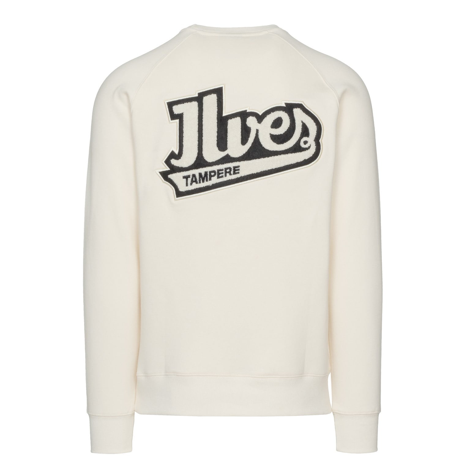 Luonnonvalkoinen collegepaita, jossa chenille-merkkauksella selässä teksti ILVES-tampere ja rinnassa seuratunnus.