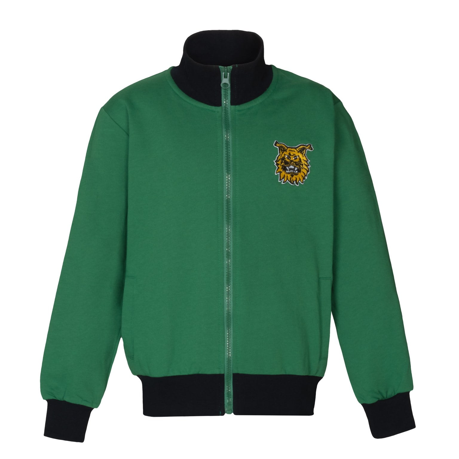 Vihreä lasten collegetakki vetoketjulla. Takissa vihreät resorit. Edessä brodeerattu seuratunnus.