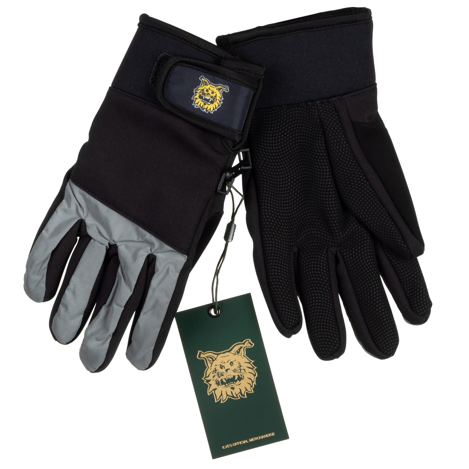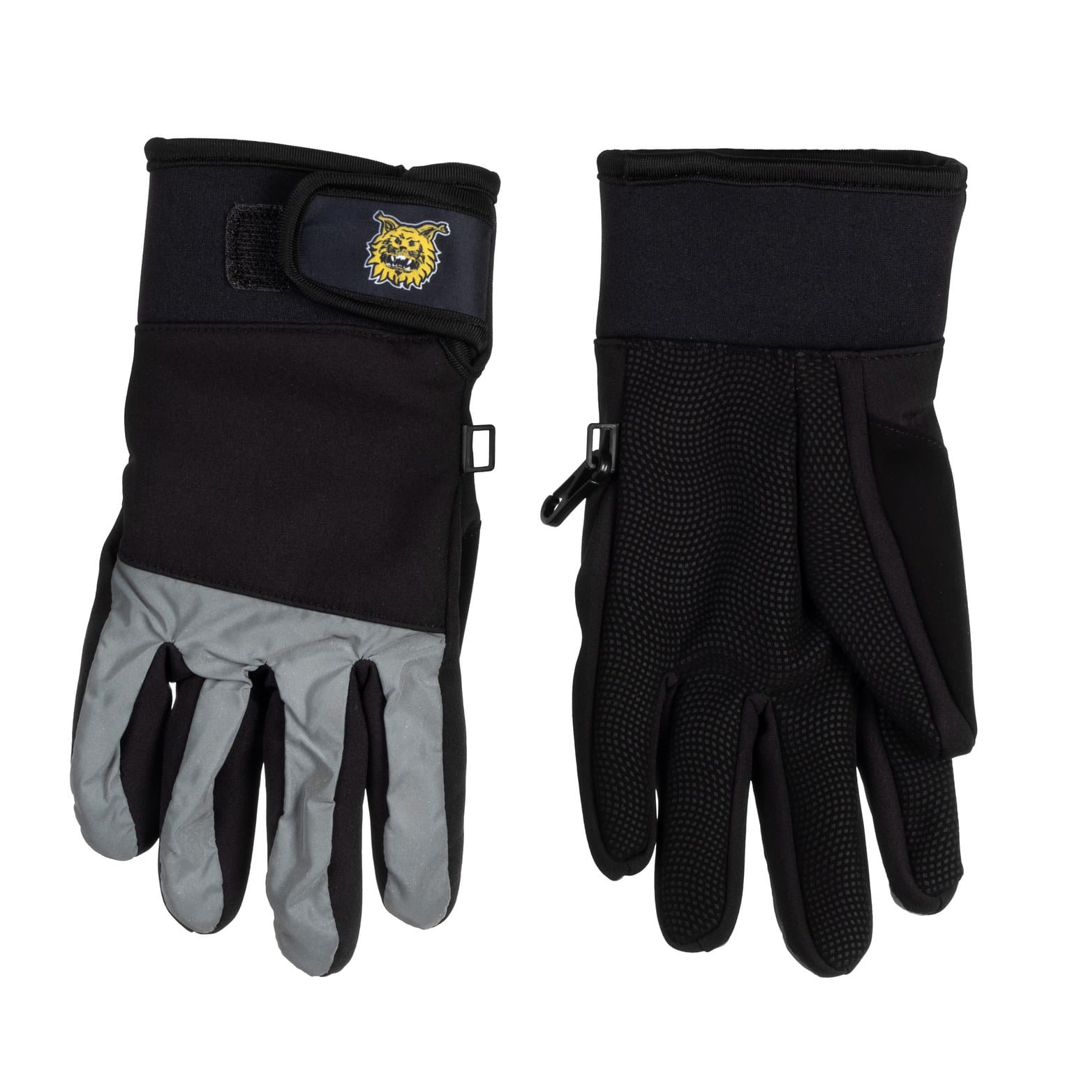 Mustat hanskat jossa heijastava osuus edessä. Seuratunnus kiristysosassa.