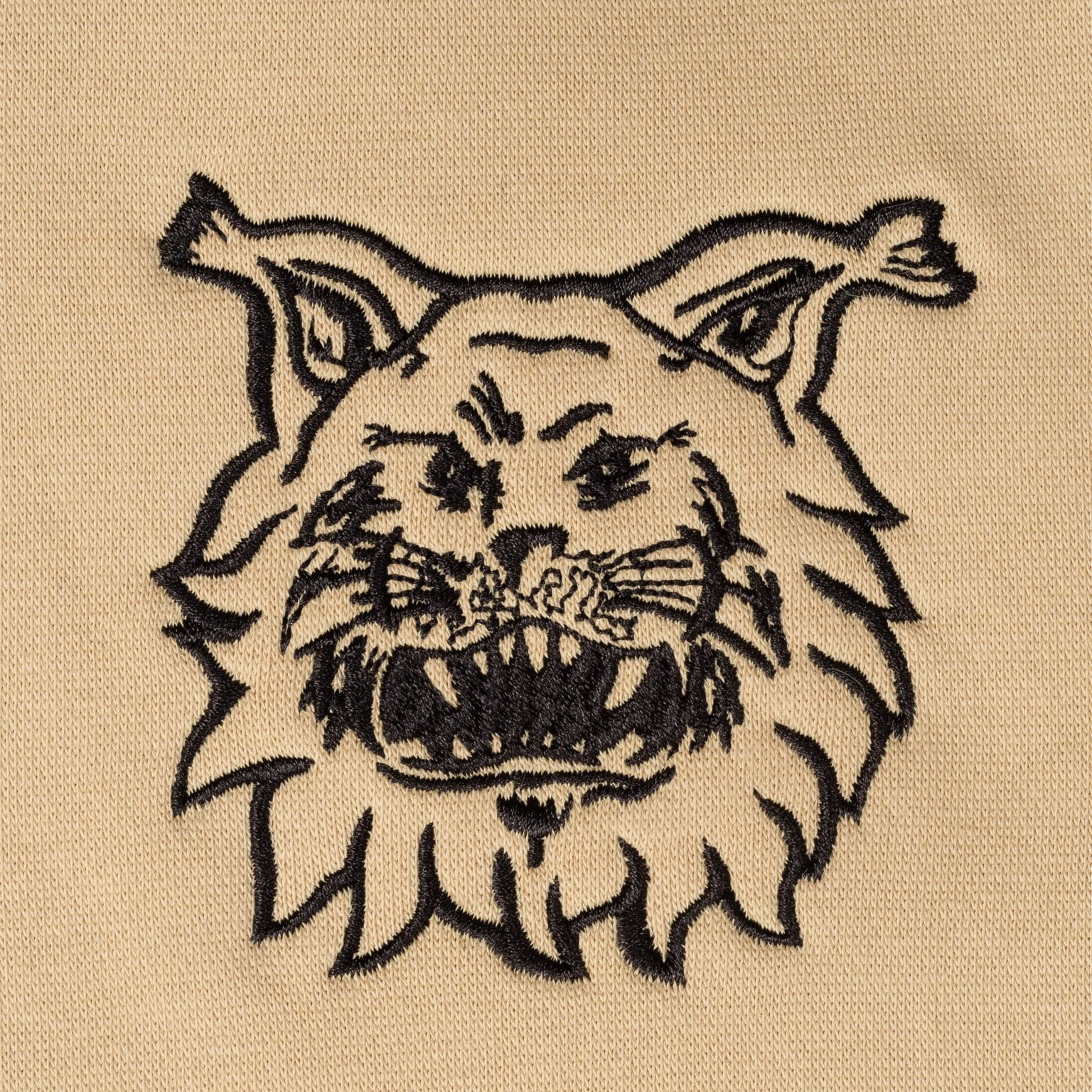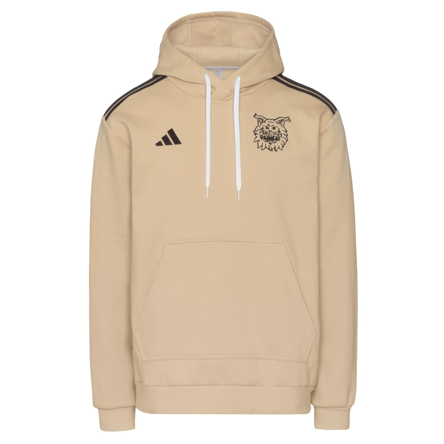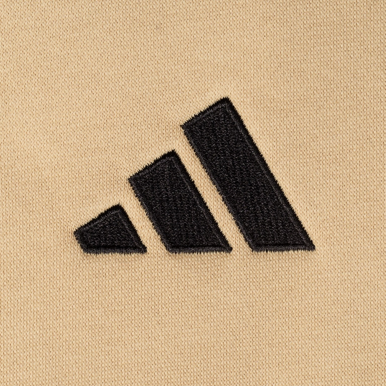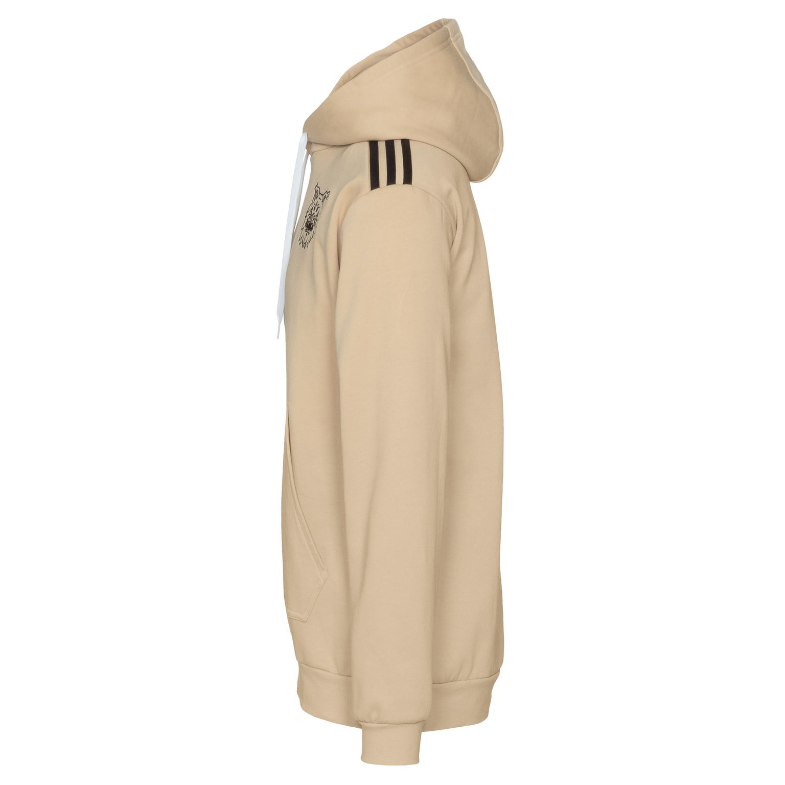 Adidaksen valmistama hiekanvärinen huppari mustilla raidoilla, jossa rinnassa brodeerattuna seuratunnus.