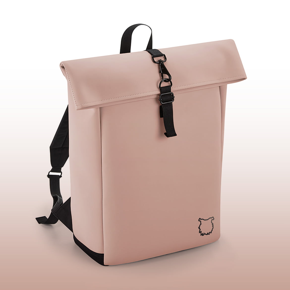 Laadukas vaaleanpunainen reppu, jossa mustat yksityiskohdat ja painettuna musta Ilves-ääriviivalogo.