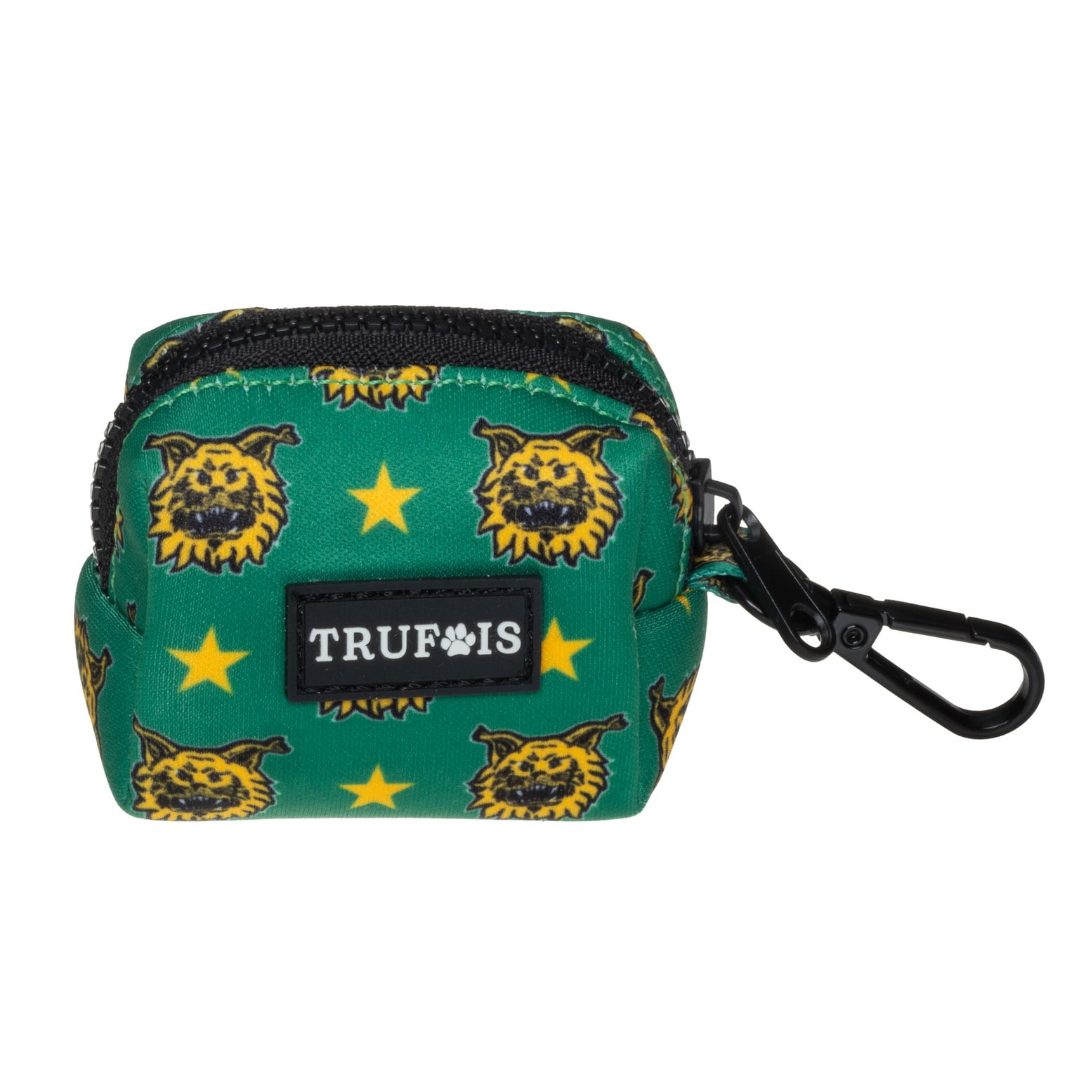 Vihreä kakkapussikotelo, jossa karabiini lukko jolla tuotteen saa kiinnitettyä hihnaan. Koko: 8 x 6 x 6cm. Kotelon mukana tulee yksi pussirulla.