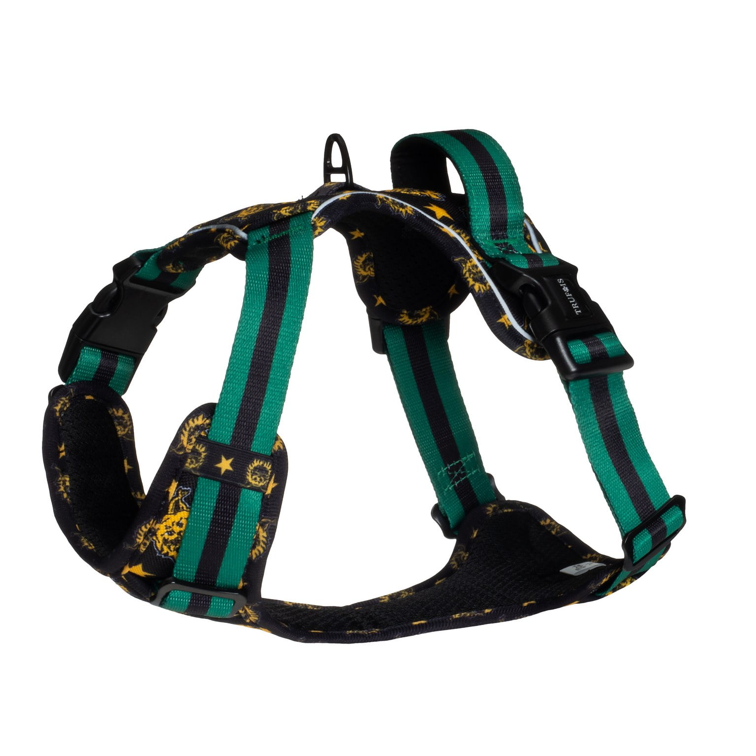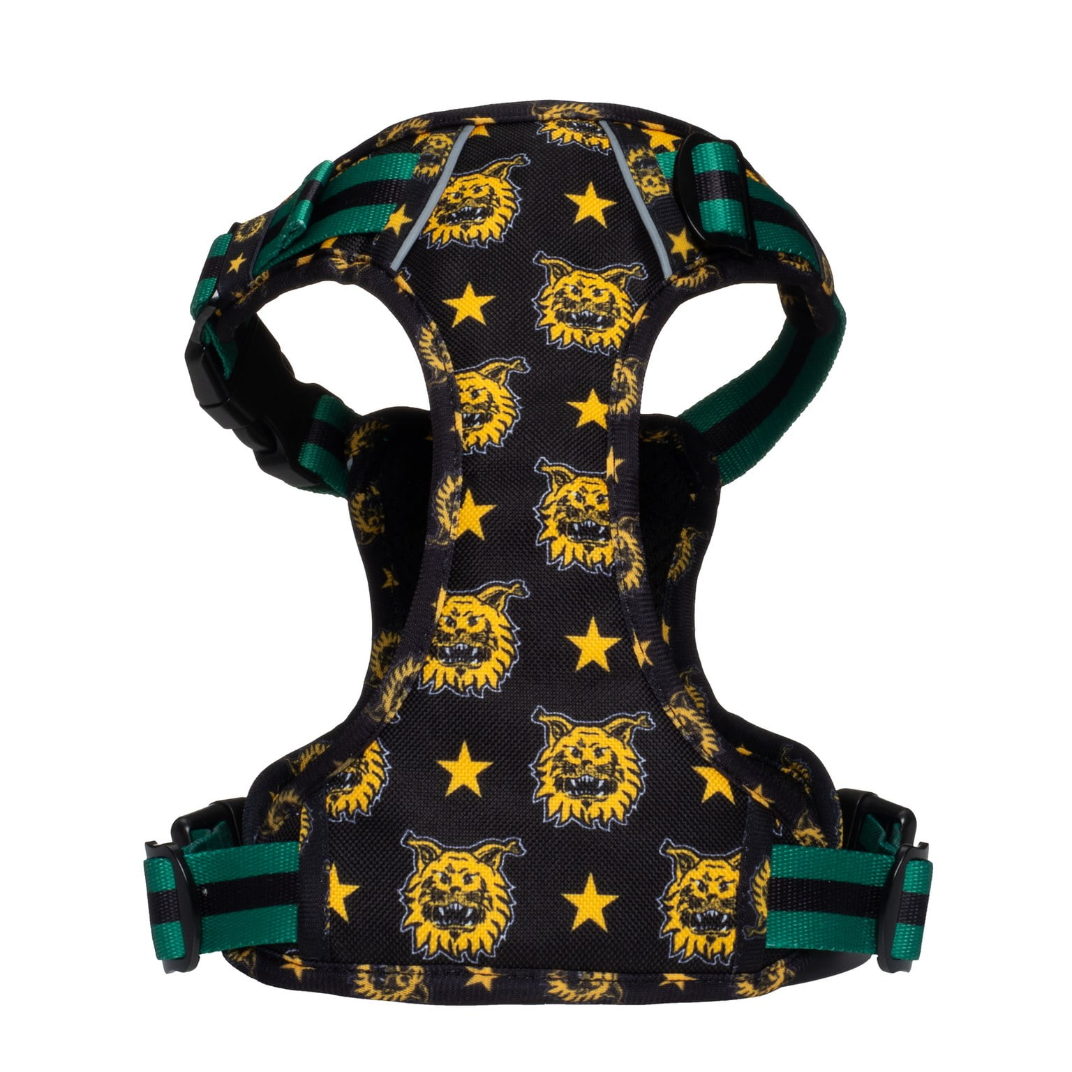 Mustat valjaat, jossa seuratunnuksia ja tähtiä. Helppo Click and go Step -in muotoilu helppoa istuvuutta varten eli ei pakko mennä koiran pään yli. D-rengas valjaan takaosassa talutushihnan kiinnitystä varten. Kestävä pehmustettu kantokahva maksimaalisen hallinnan varmistamiseksi. Vuorattu hengittävällä ilmaverkolla, lisämukavuutta ja nopeaa kuivumista varten. Turvallisuutta lisäävä lukitus solki kaulassa. Koko: kaula 35 cm-47cm ja rinta 61-76 cm.