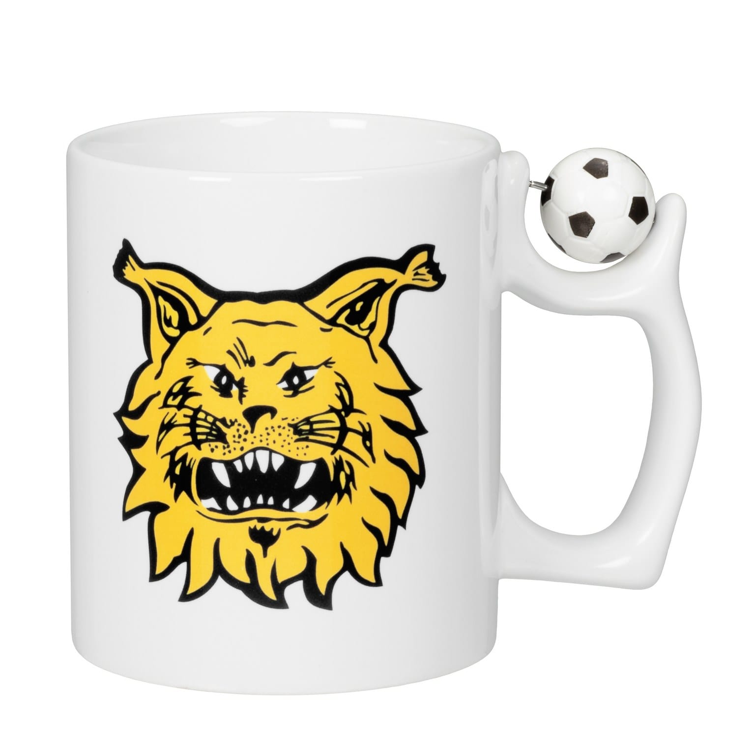 Valkoinen muki, jossa Ilves-seuratunnus ja kahvassa pyörivä jalkapallo. Suositellaan käsinpesua.