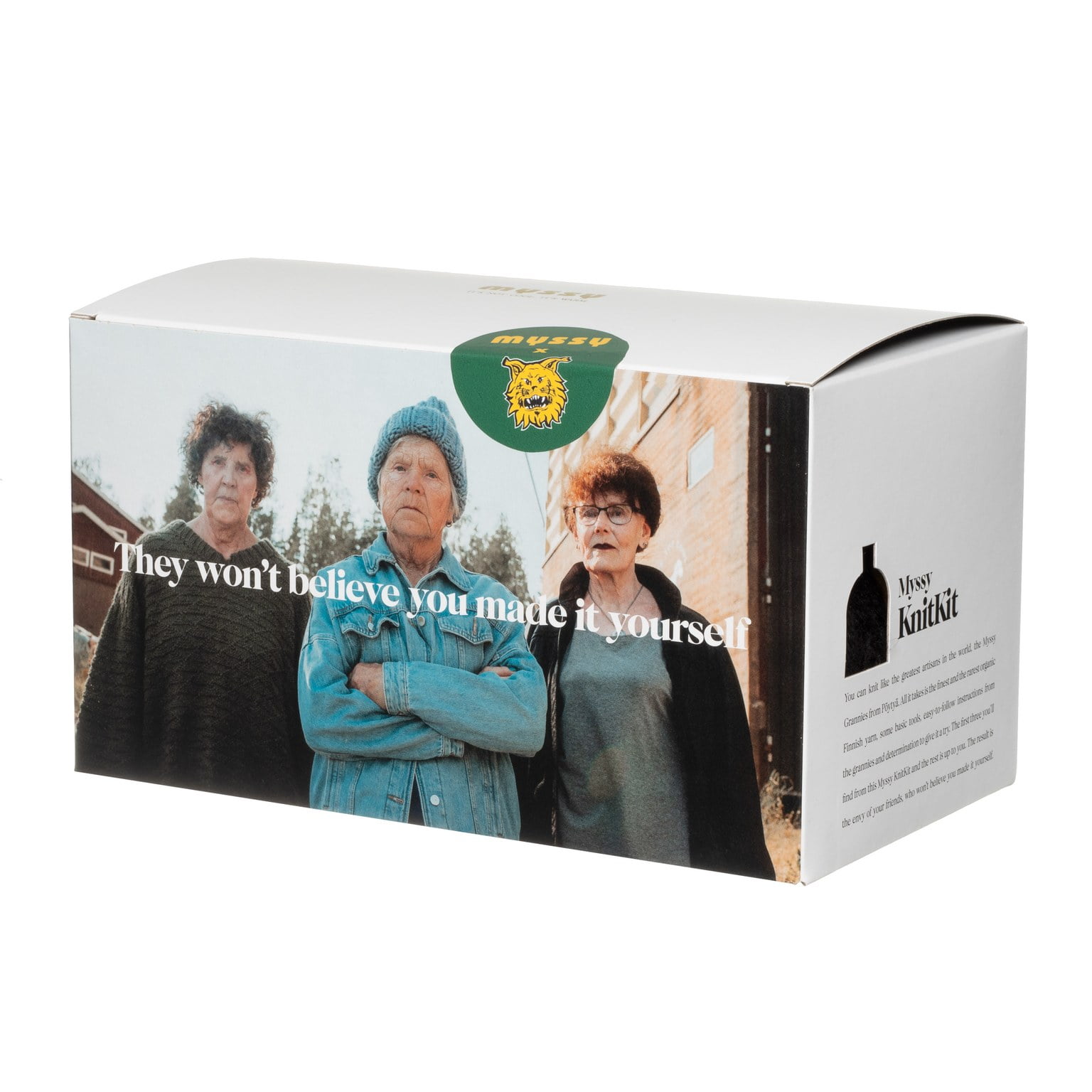 Voit neuloa kuten maailman taitavimmat käsityöläiset, Pöytyän Myssymummot! Tarvitset vain maailman pehmeintä suomenlampaan villaa, perustyökalut, Myssymummojen ohjeet ja omaa päättäväisyyttä. Kolme ensimmäistä löydät Ilves x Myssy KnitKit -paketista ja loput on kiinni sinusta. Myssy KnitKit sisältää kaiken tarvittavan Ilves -villasukkien neulomiseen ja Myssymummojen ohjeilla onnistuu aloittelijakin!