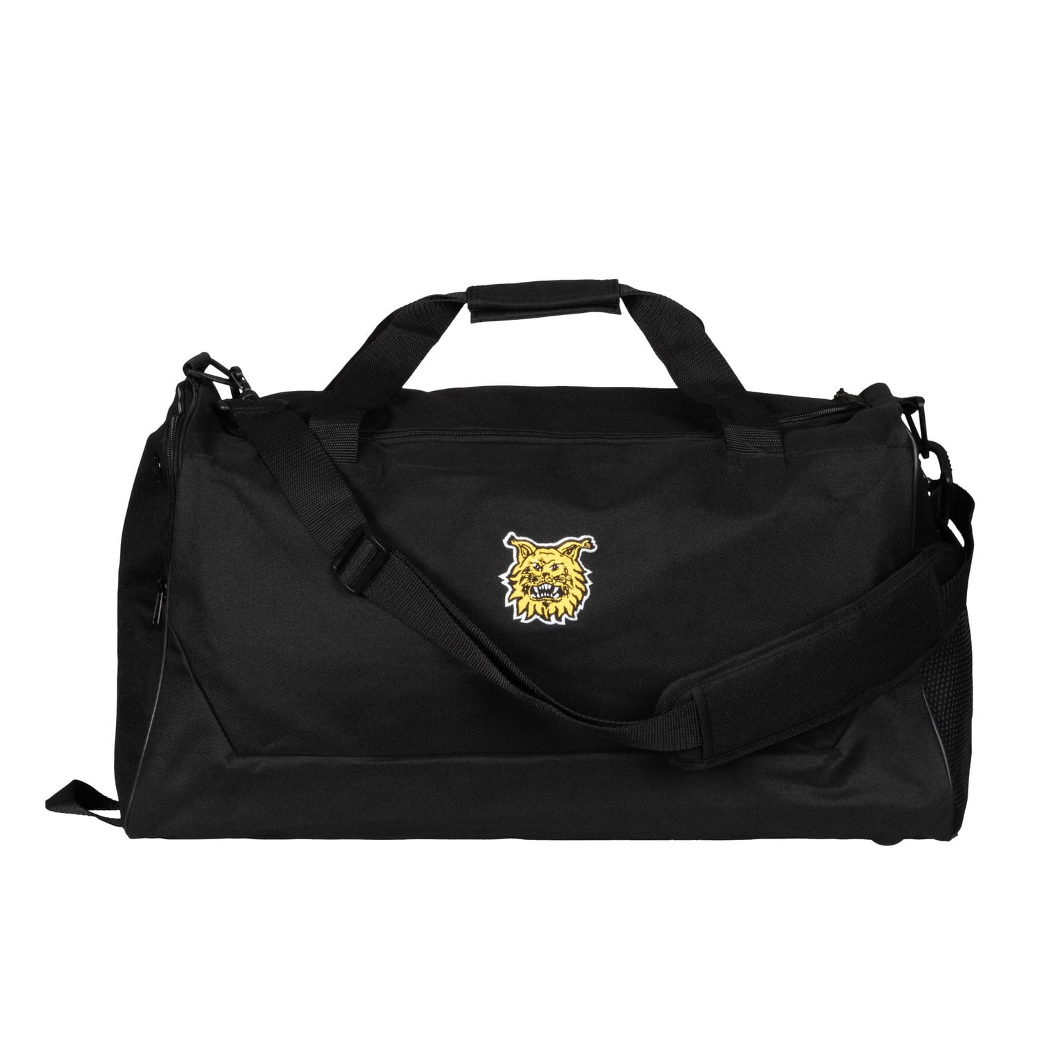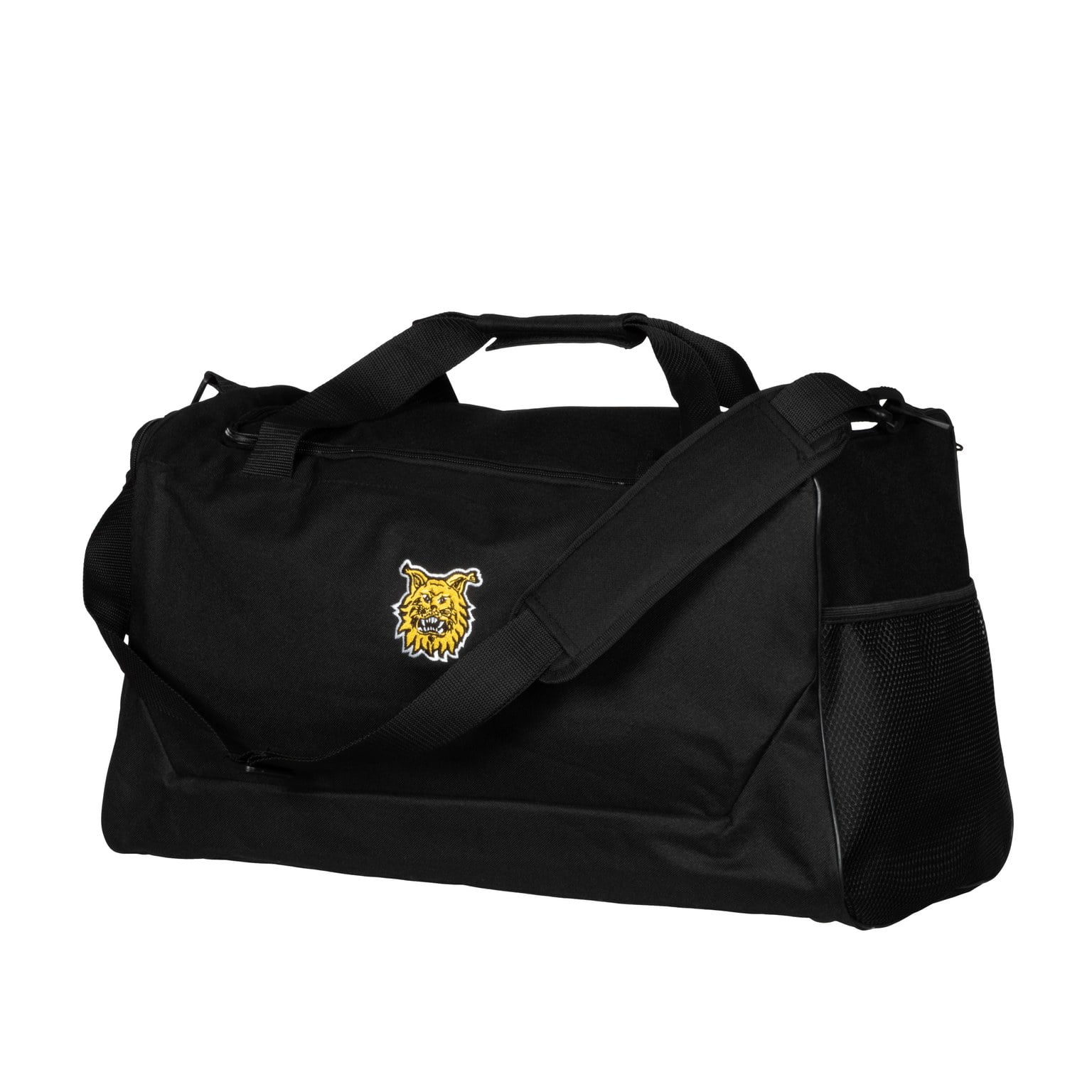 Musta treeni-ja vapaa-ajan laukku. Laukussa on kantokahvat, sekä pehmustettu olkahihna. Sivulla ja sisällä pienempi vetoketjutasku, sekä toisella sivulla verkkotasku. Edessä brodeerattu seuratunnus. Mitat: 55cm x 32cm